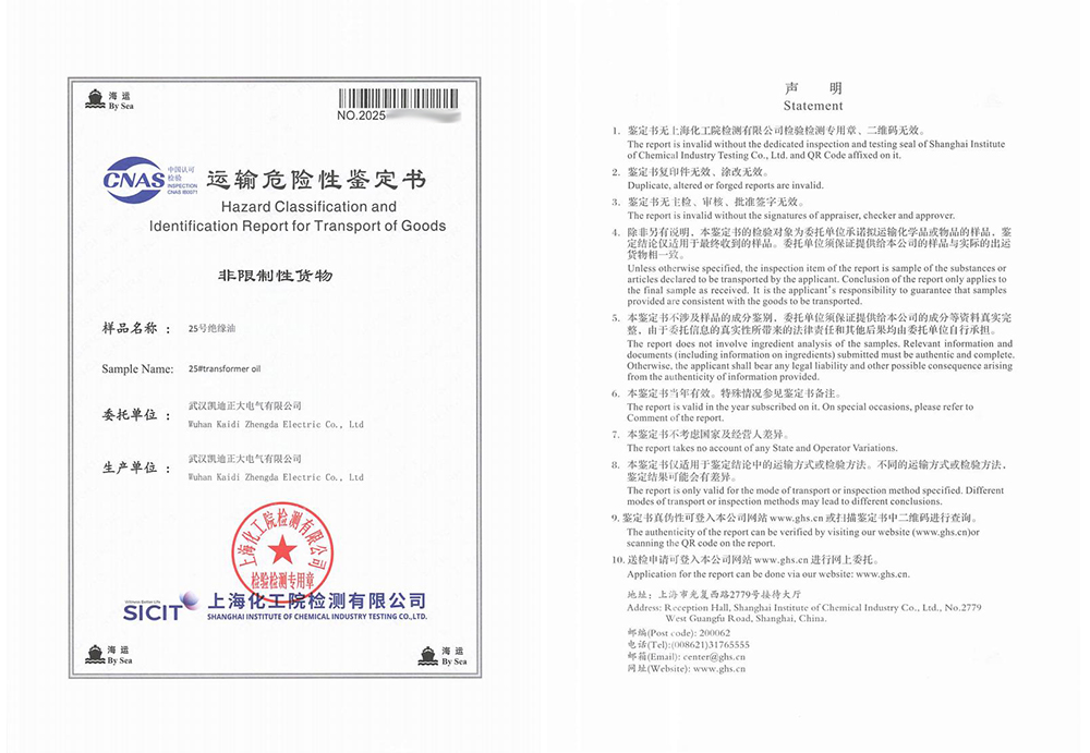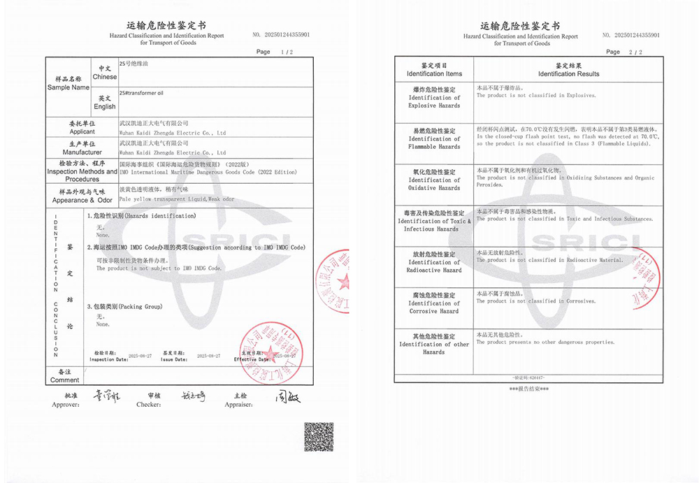 運(yùn)輸危險(xiǎn)性鑒定過程與結(jié)果詳解在國際海運(yùn)中,危險(xiǎn)品的運(yùn)輸管理有著嚴(yán)格的標(biāo)準(zhǔn)與規(guī)范,油式試驗(yàn)變壓器所用的絕緣油作為液體類物質(zhì),是否屬于易燃易爆危險(xiǎn)品,需通過專業(yè)的運(yùn)輸危險(xiǎn)性鑒定予以確認(rèn)。為此,武漢凱迪正大委托上海化工院檢測有限公司對(duì)KD2675設(shè)備中使用的25號(hào)絕緣油進(jìn)行了全面檢測。
